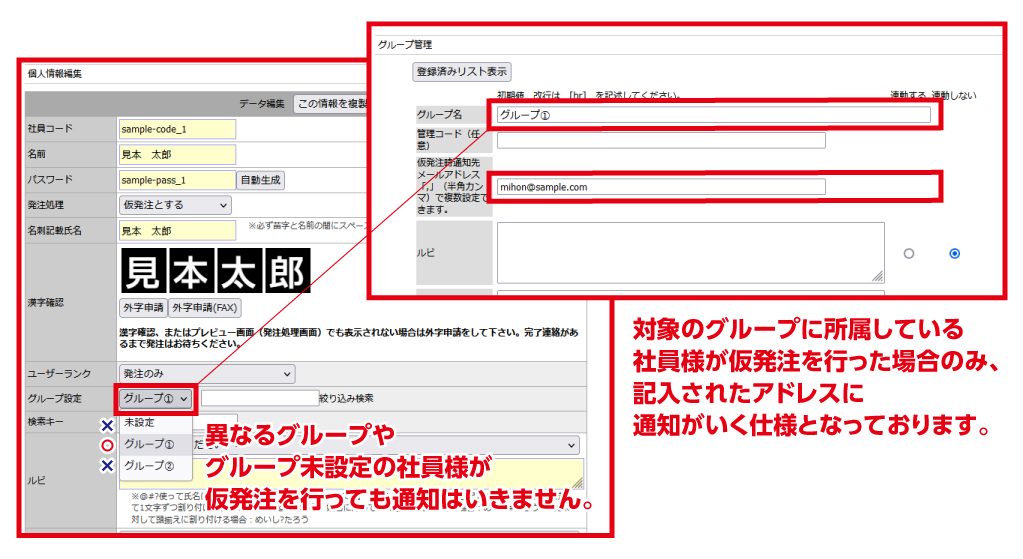 グループ管理から登録したメールアドレスに仮発注通知がこない
