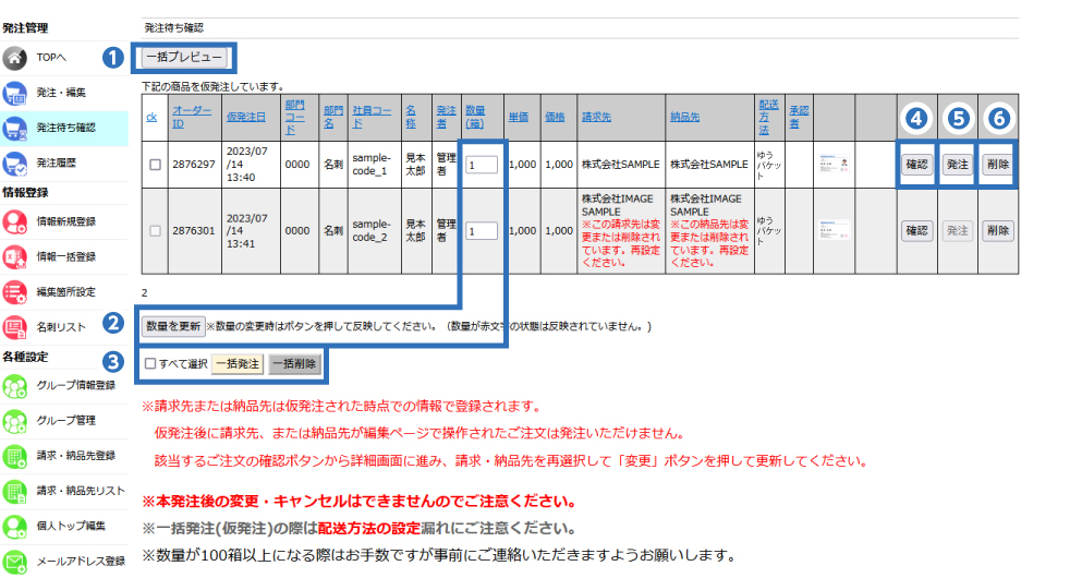❸一括発注・一括削除について