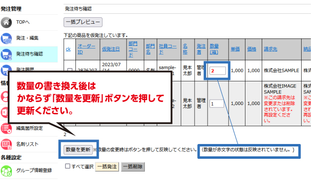仮発注分の本発注や注文内容の修正を行うことが可能です。