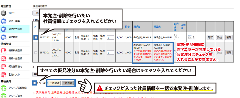 チェックが入った仮発注分を一括で本発注または削除を行うことが可能です。