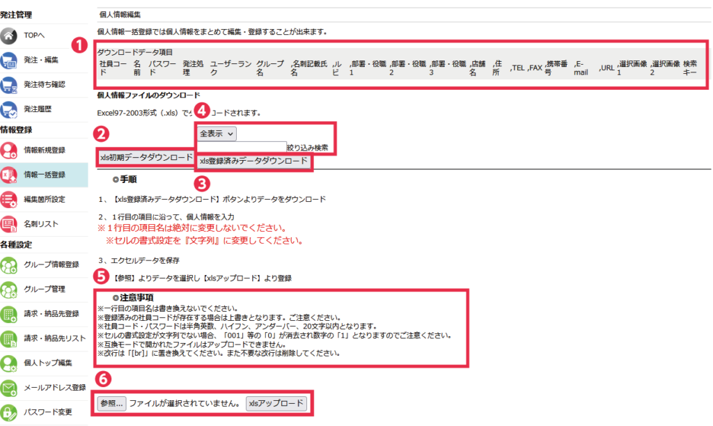※半角「"(クォーテーション)」など一部記号は.xlsでの登録では名刺情報に反映できません。発注・編集メニューから情報を編集してください。