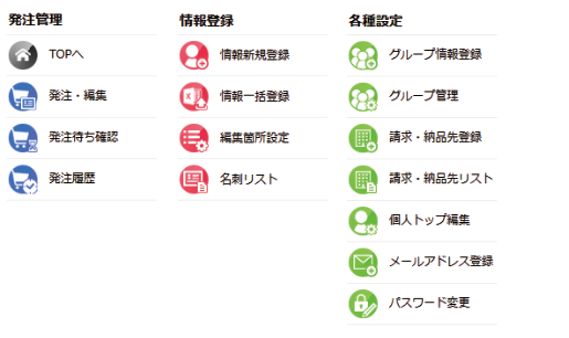 発注システム左側に表示されているメニュー項目ごとのマニュアルページです。