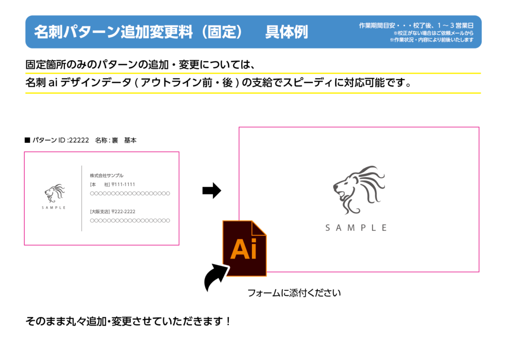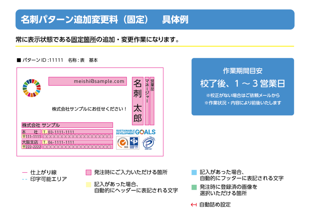 名刺パターン追加変更料(固定) 料金:1,000円 作業期間目安 校了後、1〜3営業日