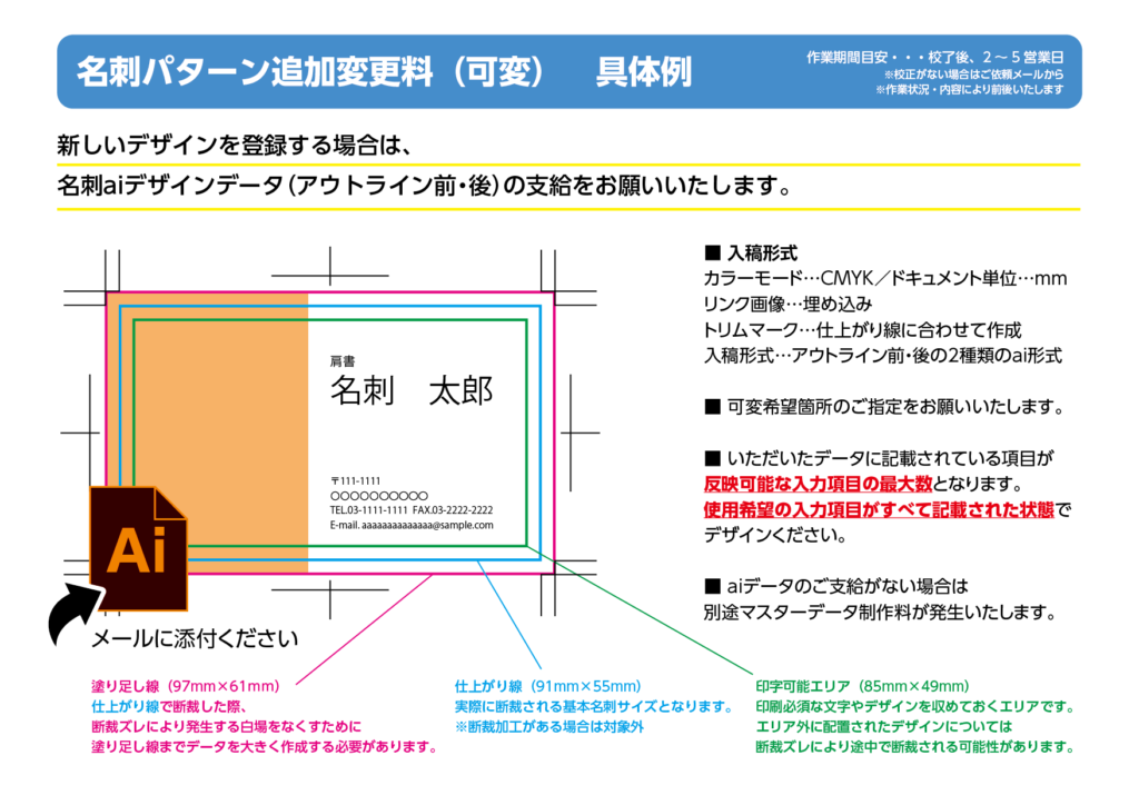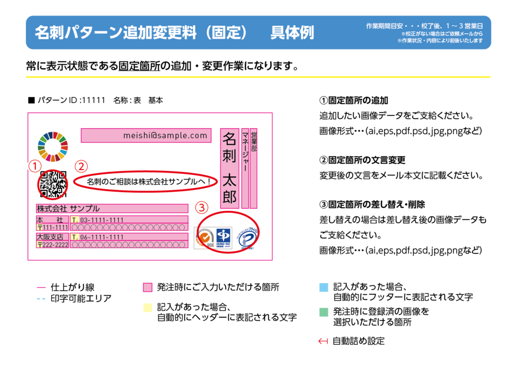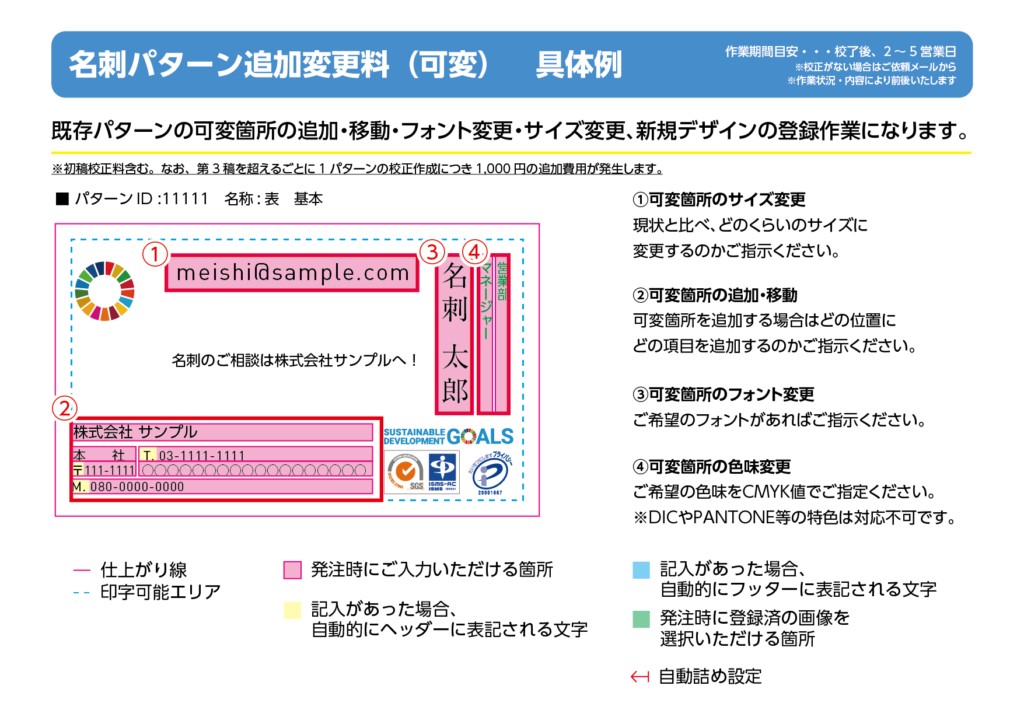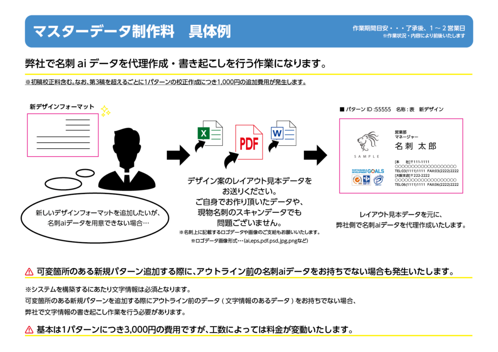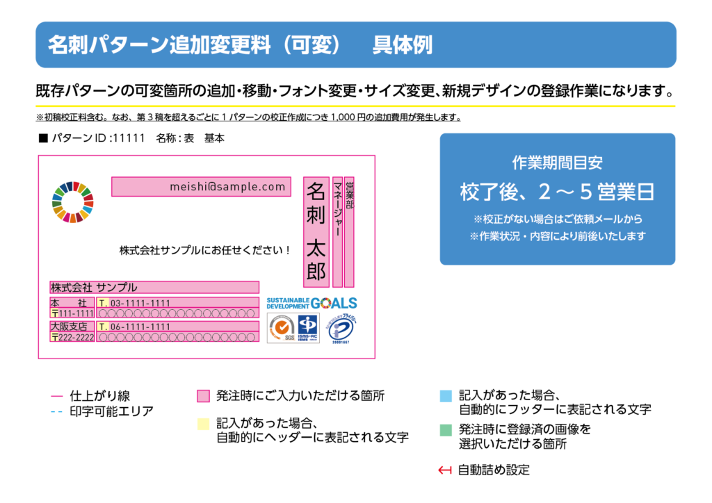 名刺パターン追加変更料(可変) 料金:3,000円 作業期間目安 校了後、2〜5営業日