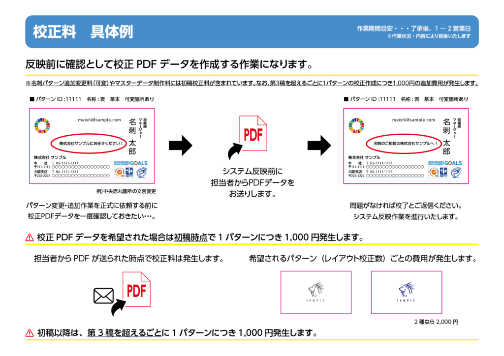 | 名刺パターン追加変更料 (固定)※1 | 1,000円 | 既存パターンの固定箇所 の簡単な修正または追加を行う場合に発生する費用。 反映前に校正PDFを希望する場合は別途校正料が発生します。具体例を確認 |