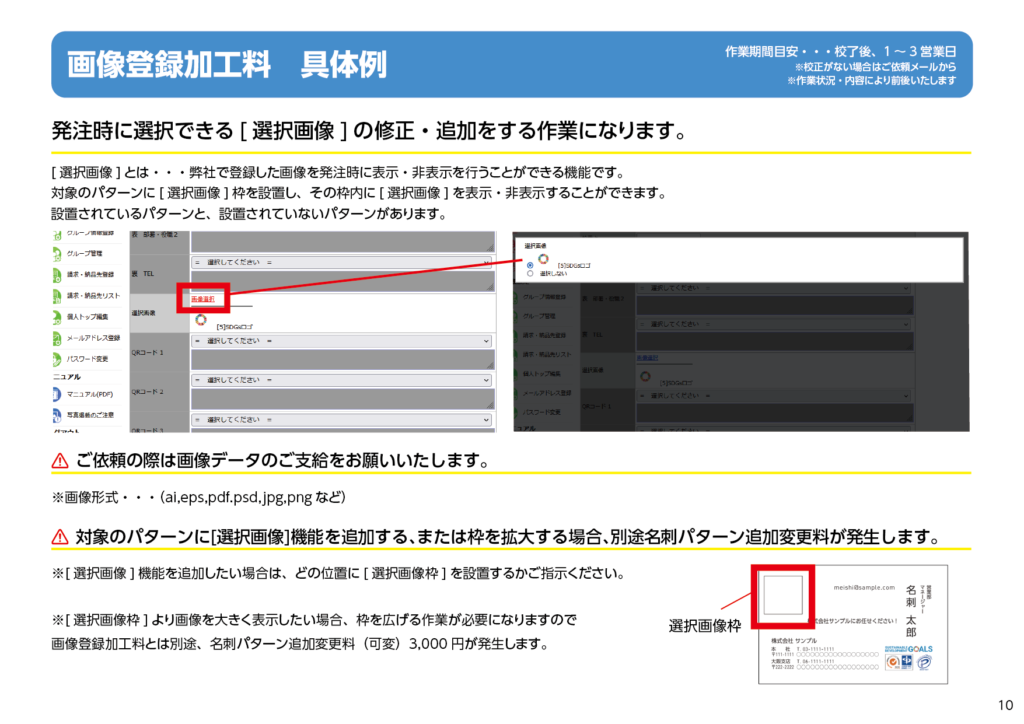 | 画像登録加工料 | 1,000円 | 発注時に選択出来る[選択画像]の修正・追加を行う場合に発生する費用。 複数パターンで同一サイズ・位置の選択画像枠を使用している場合、5パターンまでが料金に含まれます。6パターン目からは1パターンにつき500円の追加費用が発生します。 追加する画像サイズに合わせて枠を広げる必要がある場合や、 新たに[選択画像]の枠を作成する場合は別途名刺パターン追加変更料が発生します。具体例を確認 |
