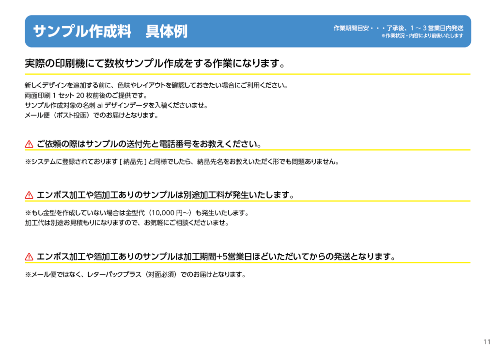 | サンプル作成料 | 500円 +送料 | 弊社の印刷機で実際に印刷を数枚行う場合に発生する費用。具体例を確認 両面印刷1セットにつき20枚程度の印刷になります。※送料は配送方法によって異なります。 |
