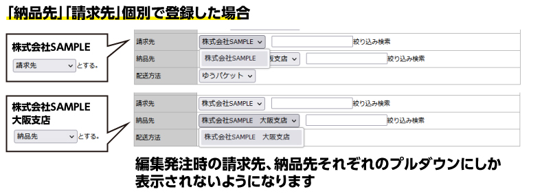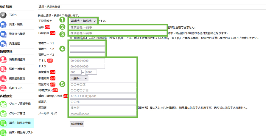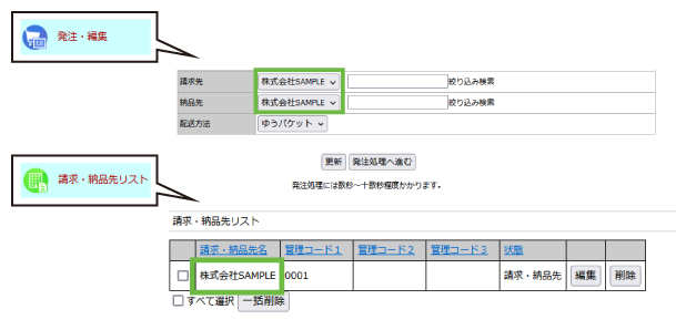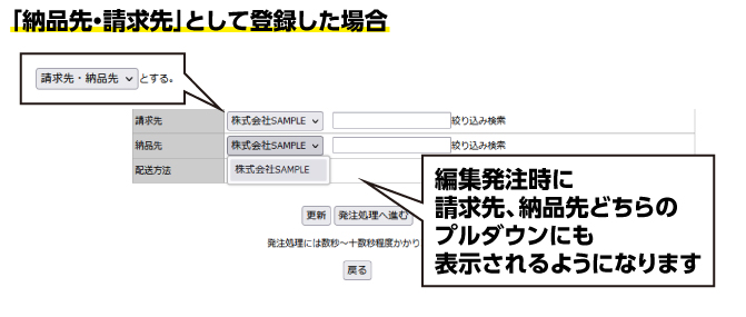※左側メニュー【請求・納品先リスト】や編集発注時のプルダウンなどで表示される名称になります。