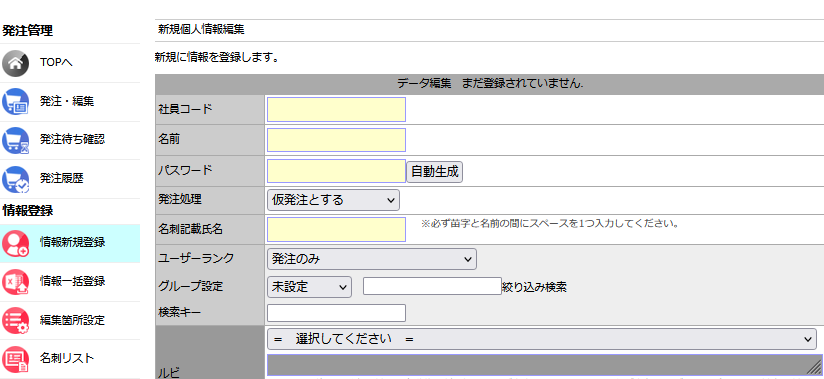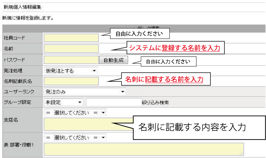 必須項目・・・社員コード/名前/パスワード/名刺記載氏名